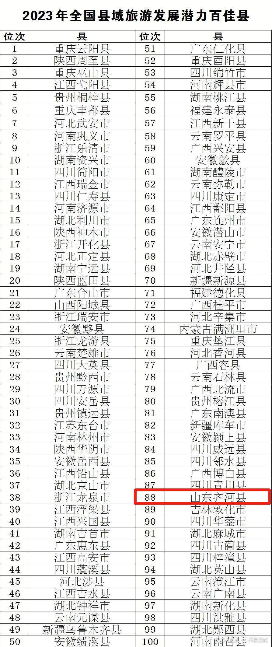 近日,全国县域旅游研究课题组、华夏佰强旅游咨询中心联合发布第五届全国县域旅游研究成果《全国县域旅游高质量发展研究报告2023》暨“2023年全国县域旅游综合实力百强县”“2023年全国县域旅游发展潜力百佳县”名单。齐河入选“2023年全国县域旅游发展潜力百佳县”,为全省唯一。