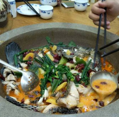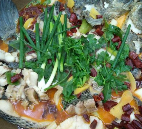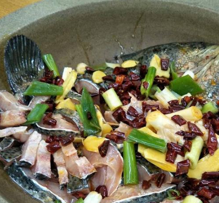 老板点的是一道鱼,等到菜端上桌子的时候,我们才知道,这不是一般的鱼啊,起码得有7斤。听服务员说这叫黑鱼,服务员还说,黑鱼骨刺少而营养丰富,比鸡肉、牛肉所含的蛋白质高。重要的是黑鱼有滋补调养的功效,还能促进伤口的愈合。