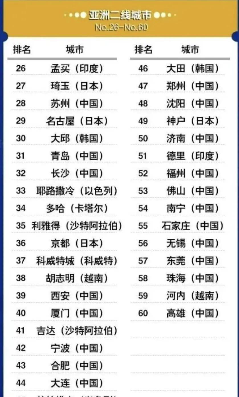 在这35个亚洲二线城市中表现的比较亮眼的城市的分别是:孟买,苏州,名古屋,青岛,多哈,京都,胡志明,宁波,合肥,郑州,沈阳,济南,德里,佛山,南宁,珠海,河内,高雄。