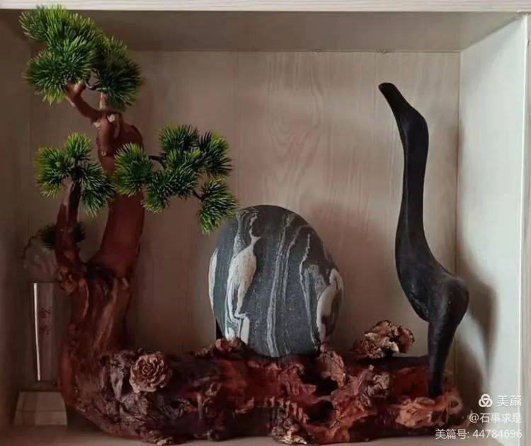 该石组合整体布局简洁典雅,比例协调,色彩搭配合理,主体与陪衬的关系安排恰当,展现了“鹤鸣九皋”的美好画面。其寓意高远,既比喻贤士隐身于高雅之所,又有高人发声于不同凡响之处的意思。