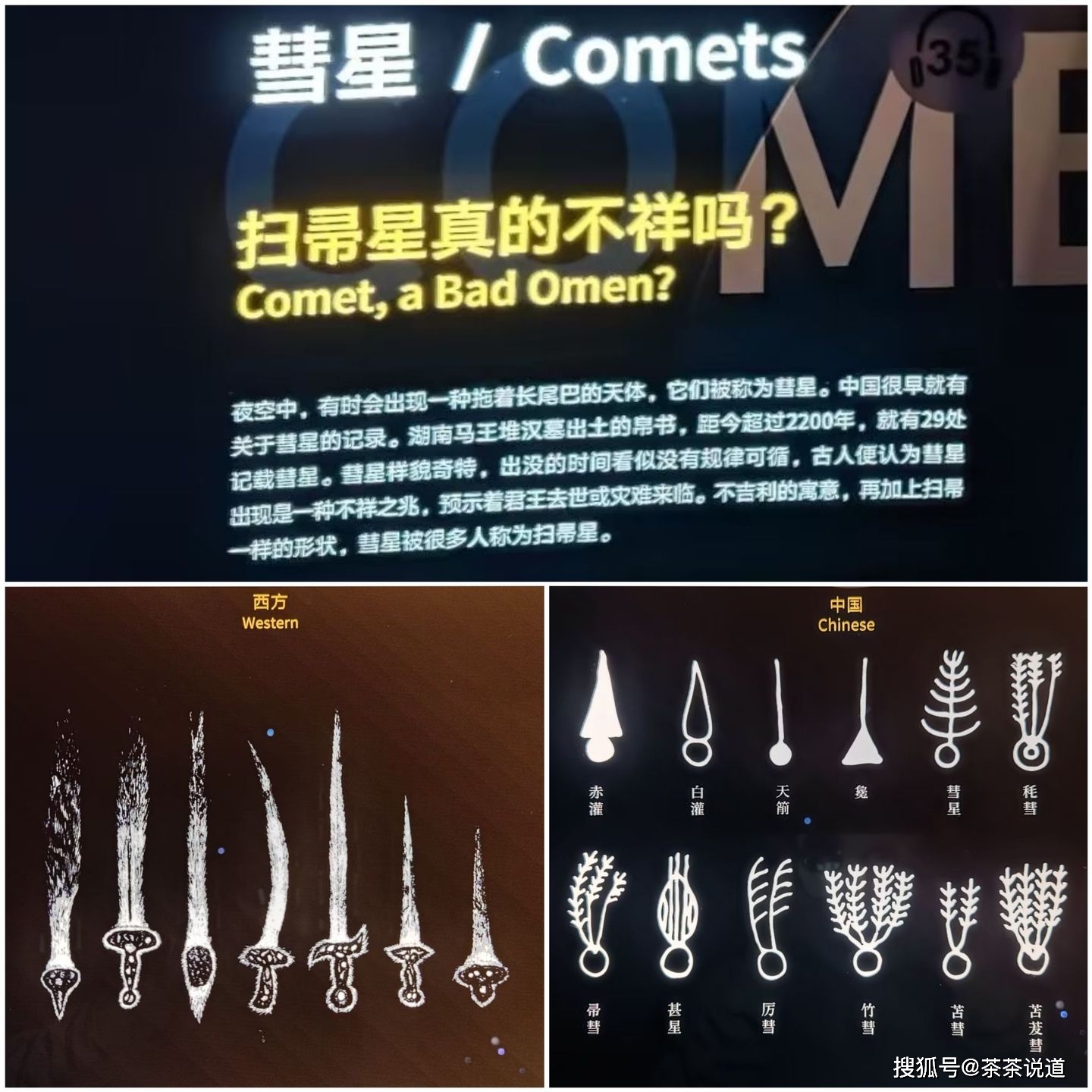 可以看到各种形状的彗星(也叫扫把星)。第一次知道,原来彗星的尾巴形状这么多,总体来说中国登记在册的彗星尾巴更接近扫把的造型;西方的彗星尾巴更细更尖,看上去就像一把长剑。