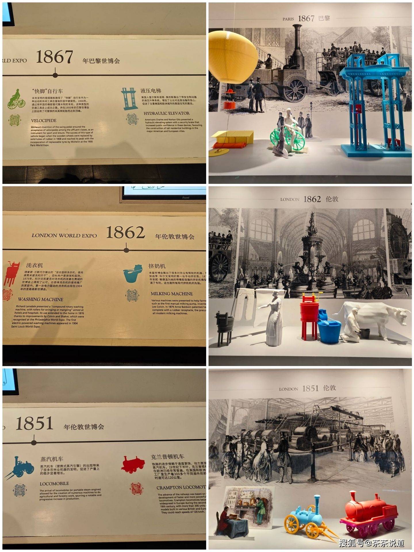 1851年伦敦世博会上的蒸汽汽车、克兰普顿机车;1862年伦敦世博会上的挤奶机、洗衣机;1867年巴黎世博会上的液压电梯,”快脚自行车“等。