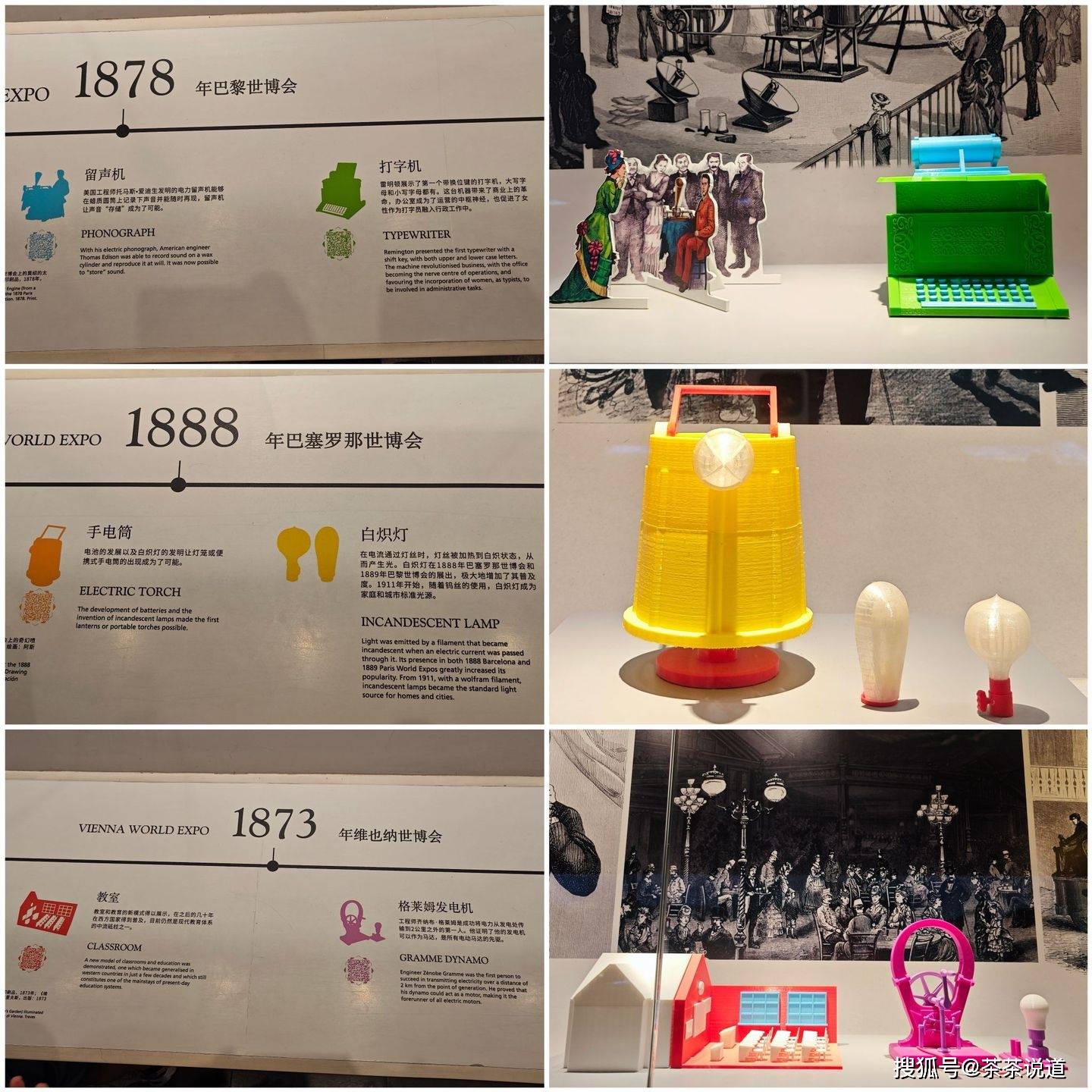 1873年维也纳世博会上的教室、格莱姆发电机;1888年巴塞罗那世博会上的手电筒、白炽灯;1878年巴黎世博会上的留声机、打字机……