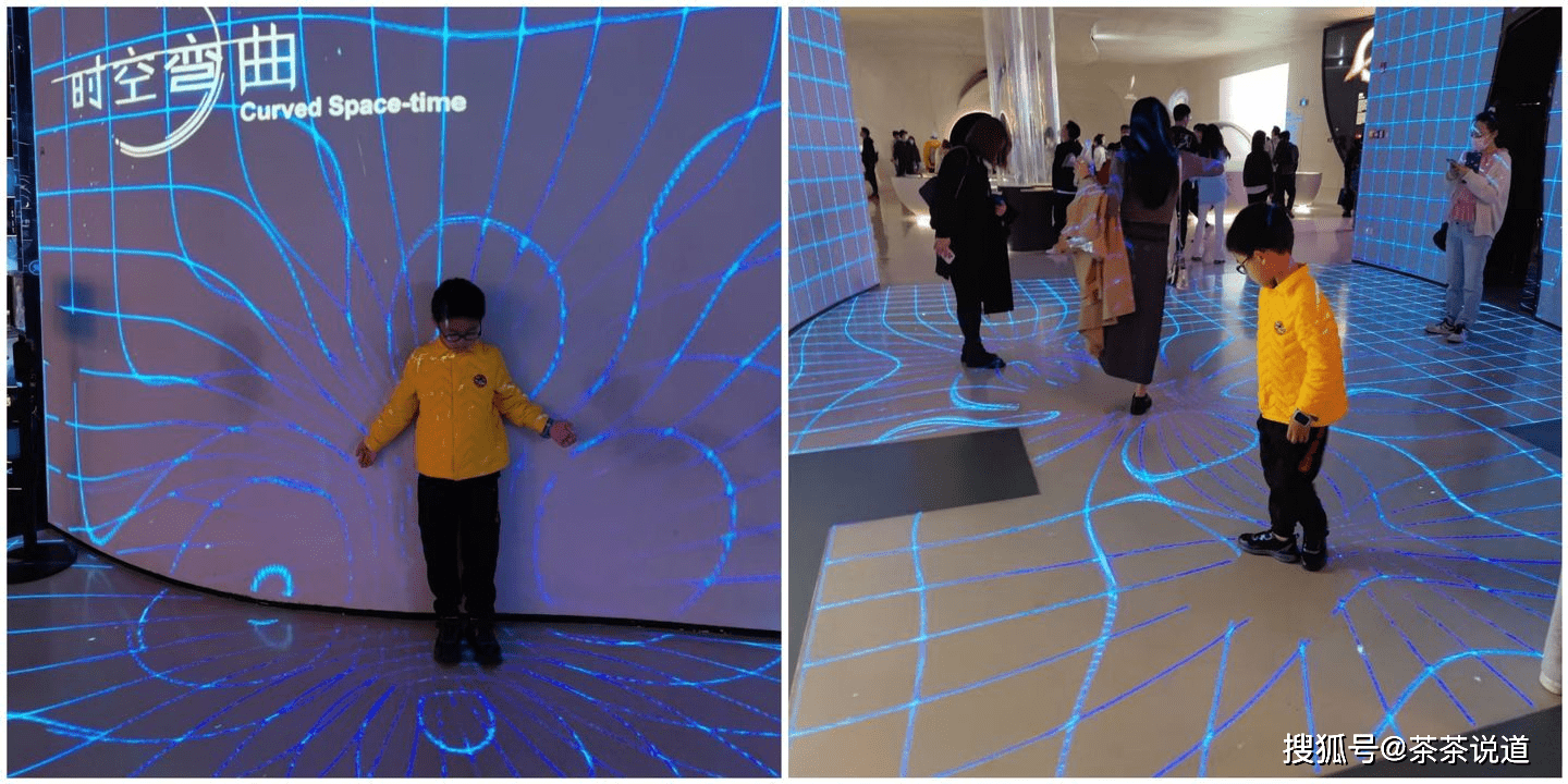 在时空弯曲还可以玩互动游戏。只要站在四方格里,地面、墙面就会出现弯曲的现象,特别有意思。