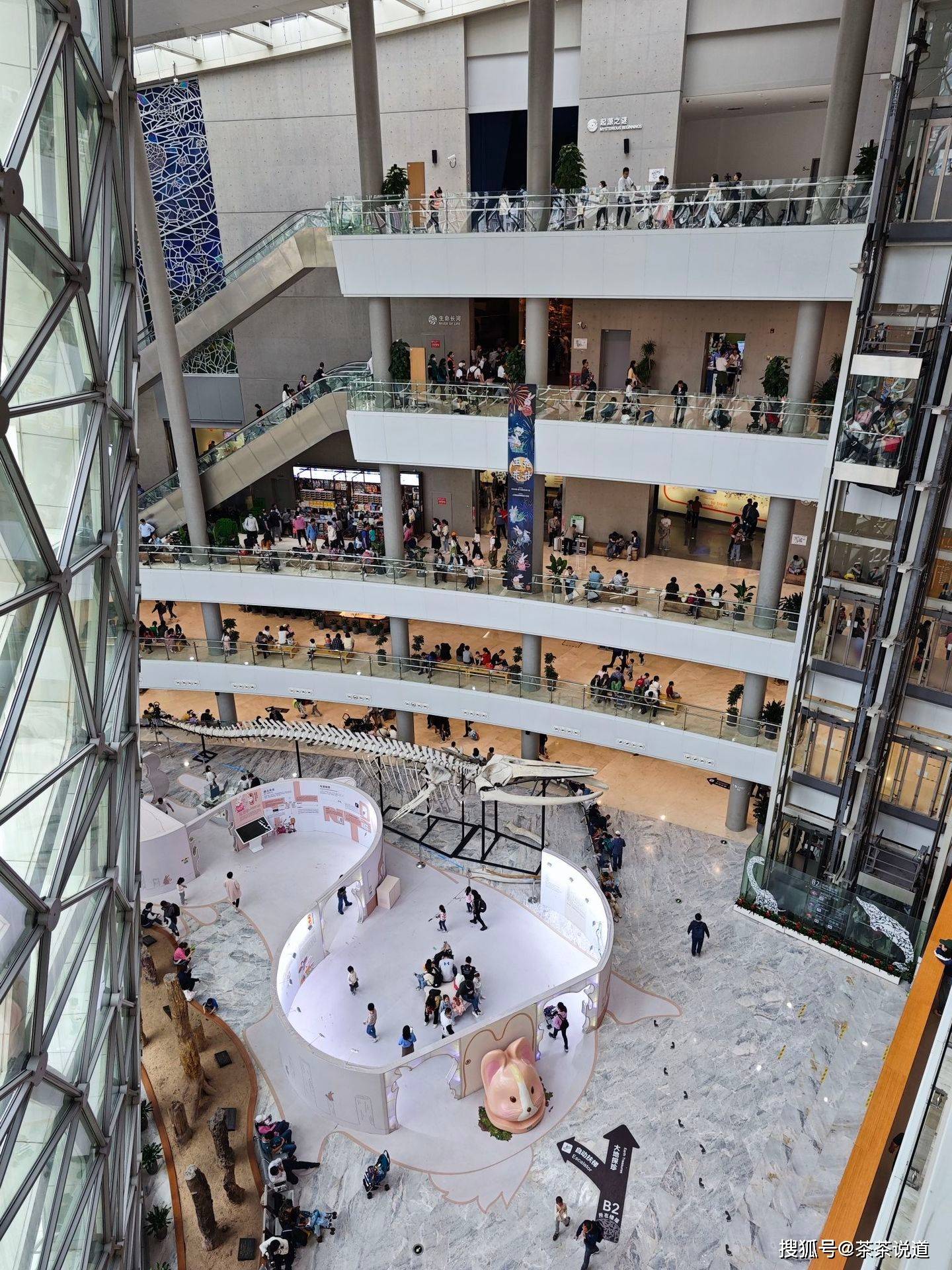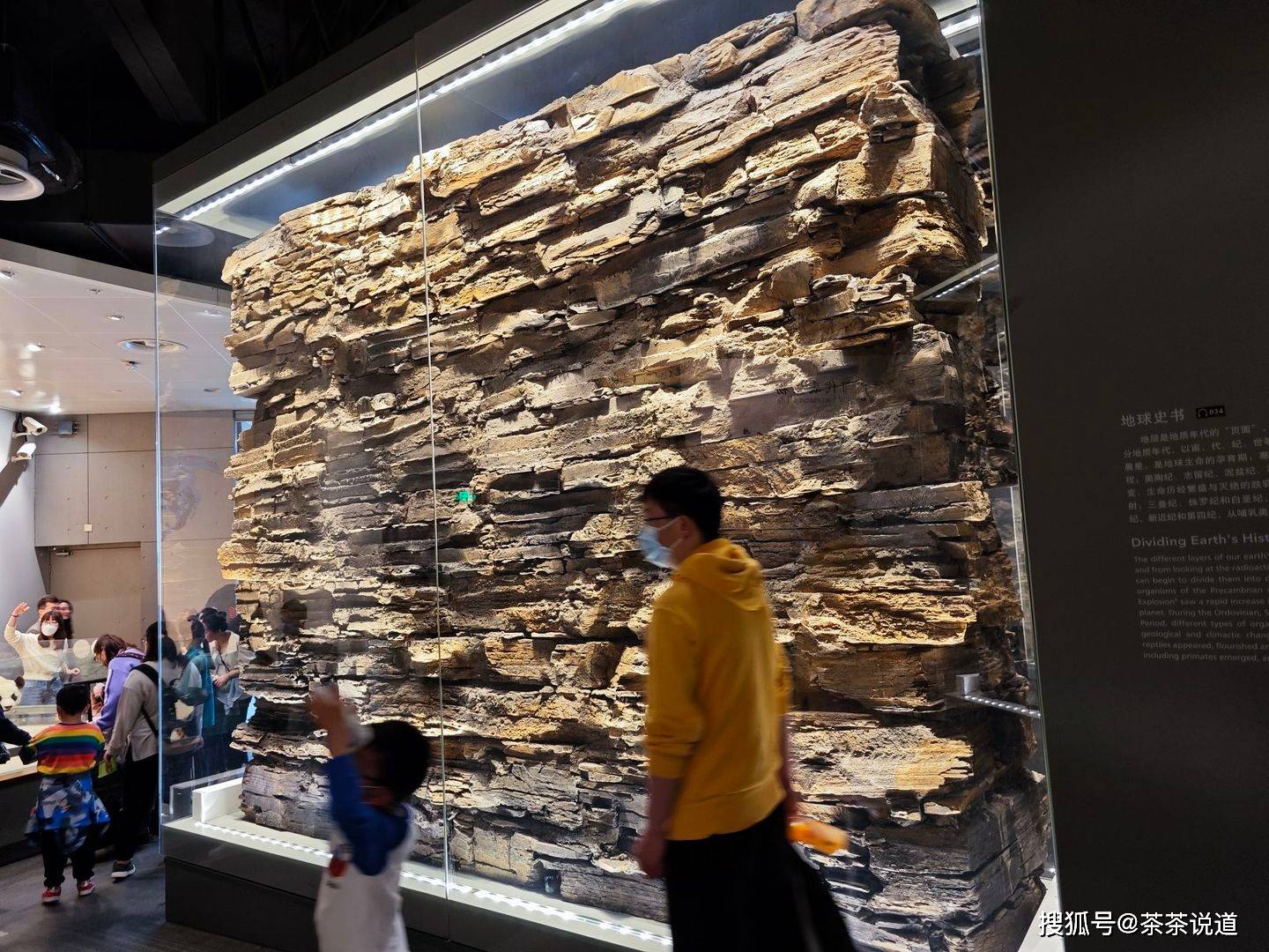 玻璃房内是巨大的地层。地层是地质年代的”页面“,依照地层中的化石类型或放射性同位素划分地质年代,以宙、代、纪、世等层级标注。