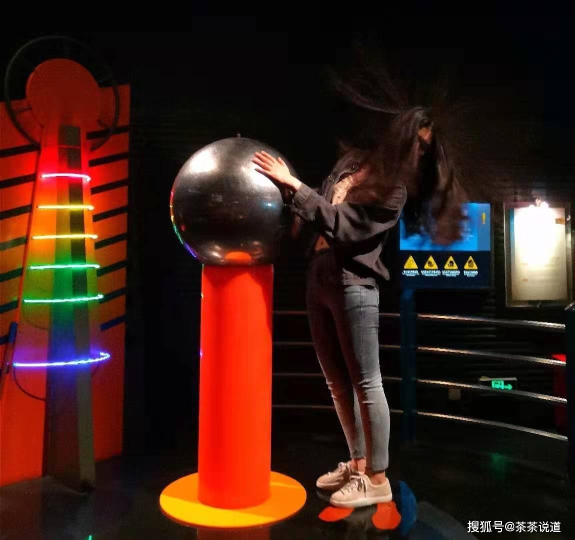 可以用手摸这个圆球,体验电流抵达指尖的酥麻感,也能看到如闪电般明亮绚丽的电流。