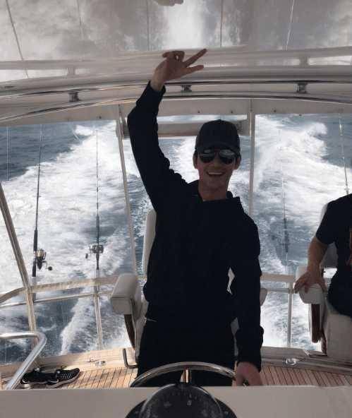 自己驾驶着游艇,笑对镜头比起了剪刀手!