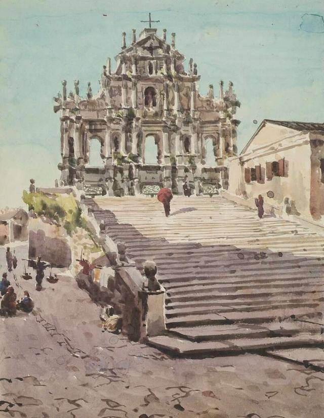 《圣保禄教堂遗址前壁》,路易斯·迪美(1928-2014),纸本水彩,34.9x24.9cm,1951。耶稣会纪念广场位于大三巴石阶的延伸区域,街面铺设葡式碎石路面,广场以纪念耶稣会为澳门所做出的贡献而命名。故宫博物院供图
