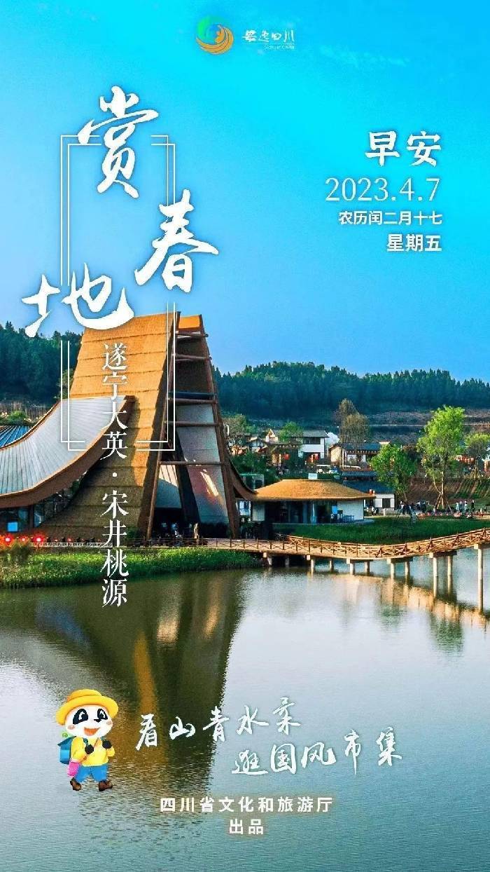 今日安逸四川日历海报赏春之旅走进遂宁大英宋井桃源,看山青水柔,逛国风市集,感受农文旅融合发展新风貌。