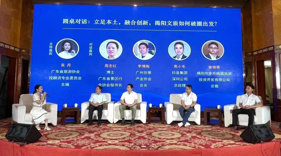 广东省旅游协会投融资专委会主编 吴丹 主持了“揭阳文旅产业高质量发展圆桌对话”,广东省景区行业协会秘书长 周志红 、广州创意产业协会会长 李博陶 、抖音集团深圳公司总经理 高小毛 、揭阳市市外桃园旅游投资开发有限公司总裁 谢锦荣 等文旅产业相关专家、代表围绕“立足本土,融合创新,揭阳文旅如何破圈出发”主题进行交流,探讨当前文旅产业发展新变化,为揭阳文旅产业高质量发展建言献策。