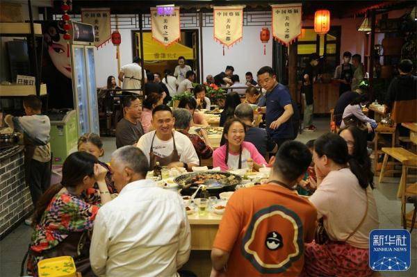 7月31日,游客在贵州省六盘水市水城古镇“天下第一锅”饮食城品尝水城烙锅。赵桦 摄