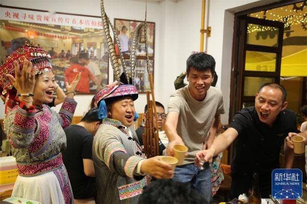 7月31日,在贵州省六盘水市水城古镇“天下第一锅”饮食城,当地苗族同胞为游客表演芦笙舞和敬酒歌。赵桦 摄