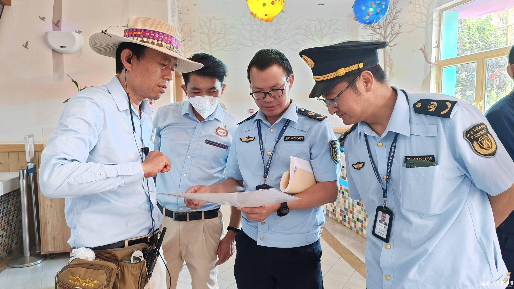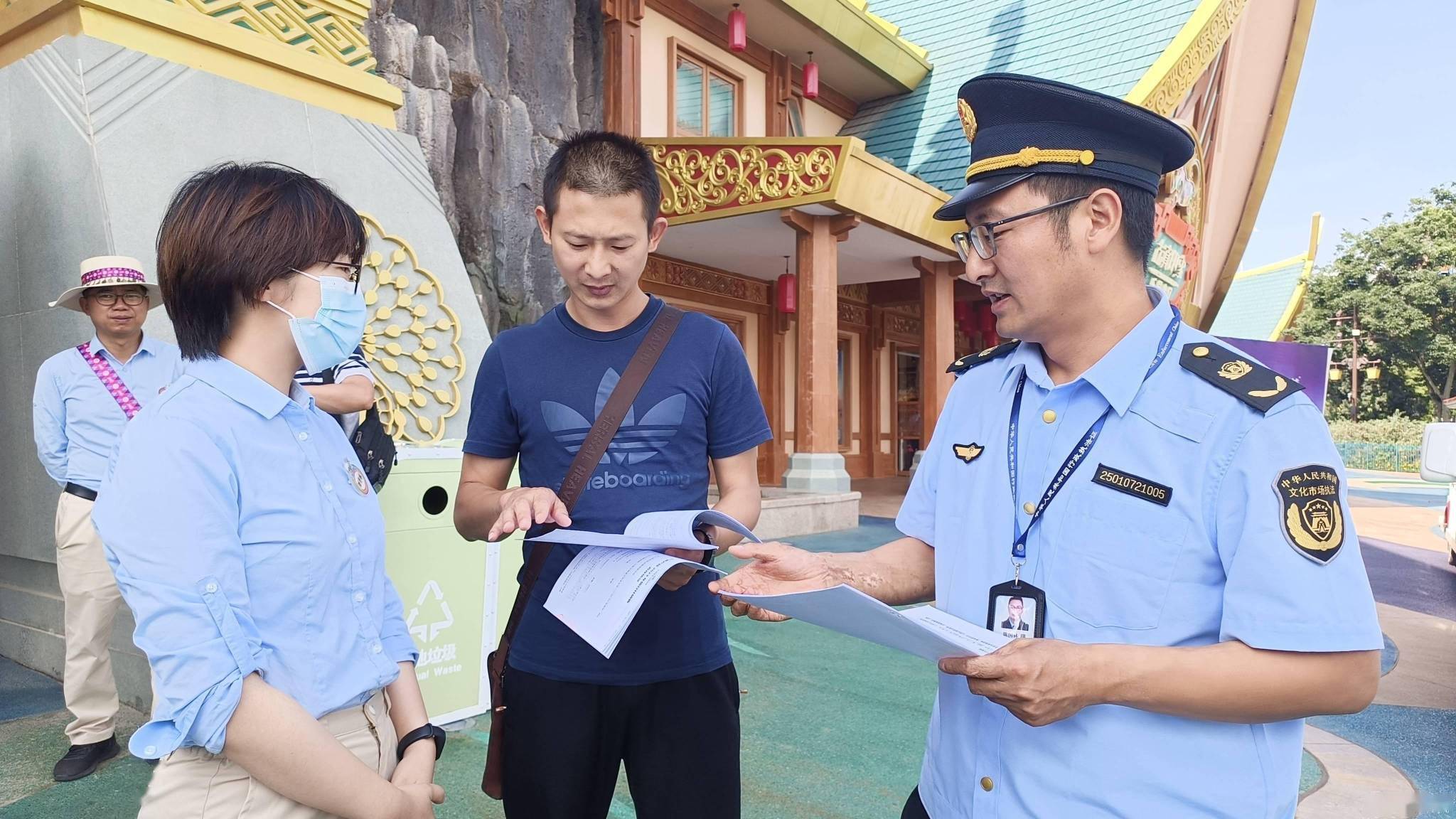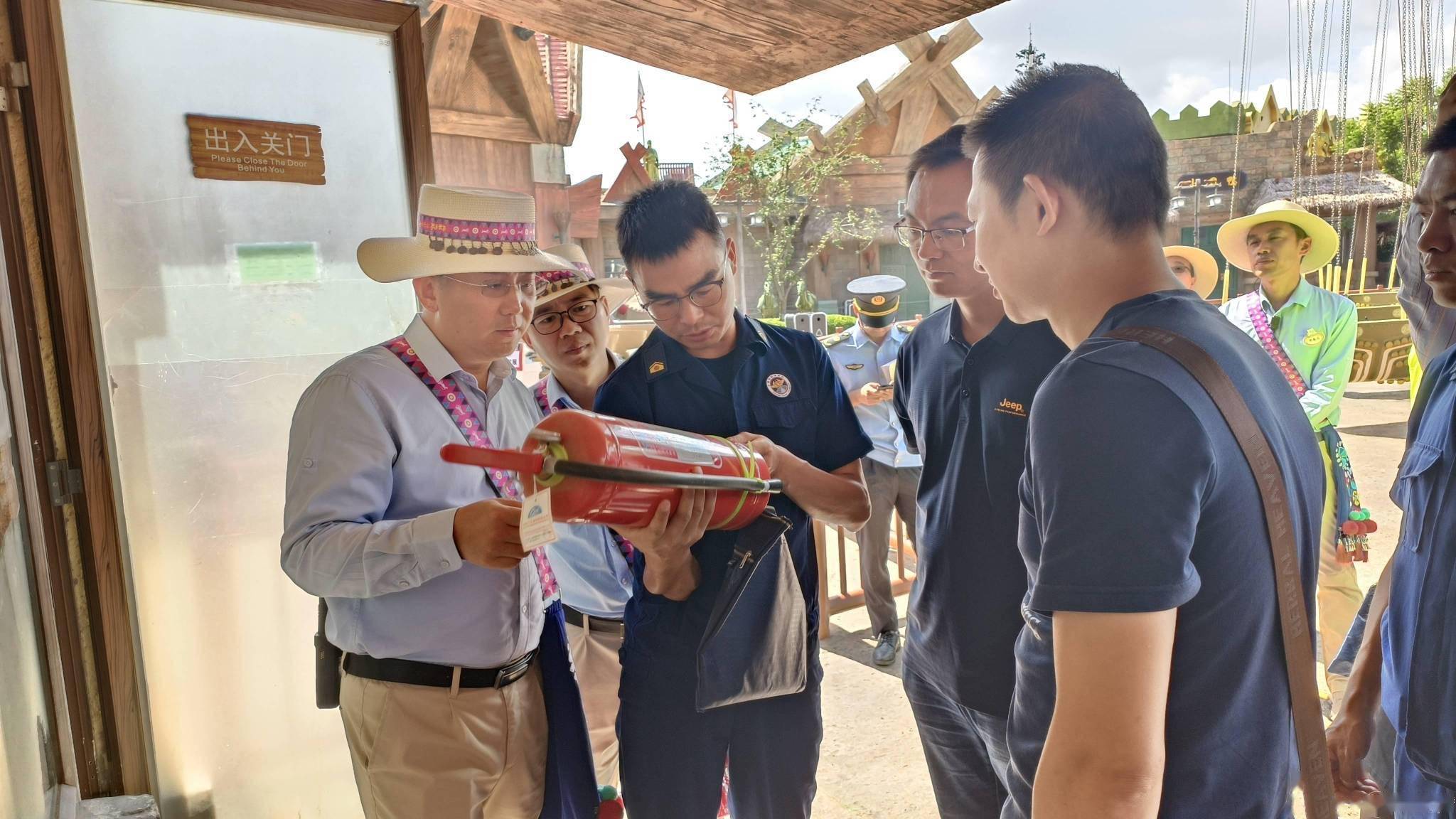 当天,由昆明市公安局晋宁分局、区文旅局、区应急局、区交运局、区市场监管局、区消防救援大队等部门相关人员组成的检查组,到七彩云南·欢乐世界进行实地走访,重点检查是否存在导游未佩戴导游证、强迫或变相强迫游客消费、擅自变更游览行程、安排团队强制购物、签订虚假合同等违法违规行为,对景区暑期消防安全、防汛安全、旅游市场秩序投诉处置、特种设备安全运营等开展检查。