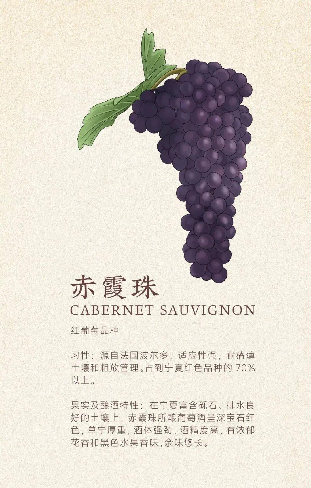 赤霞珠,原产法国波尔多,适应性极强,在世界各地都有广泛种植。在宁夏,赤霞珠占到红色品种的70%以上。大部分酒庄的第一瓶酒,往往就是用赤霞珠酿成的。