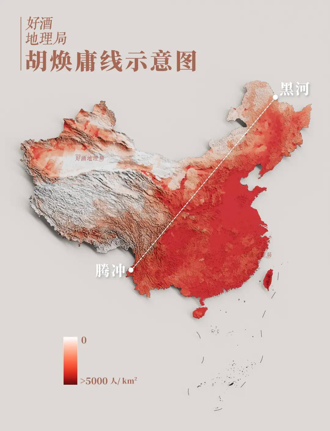 1935年,著名地理学家胡焕庸教授提出一条划分我国人口密度的对比线:东侧不到40%的国土面积,分布着96%的人口。这条线后来被国际上的专家称为“胡焕庸线”。