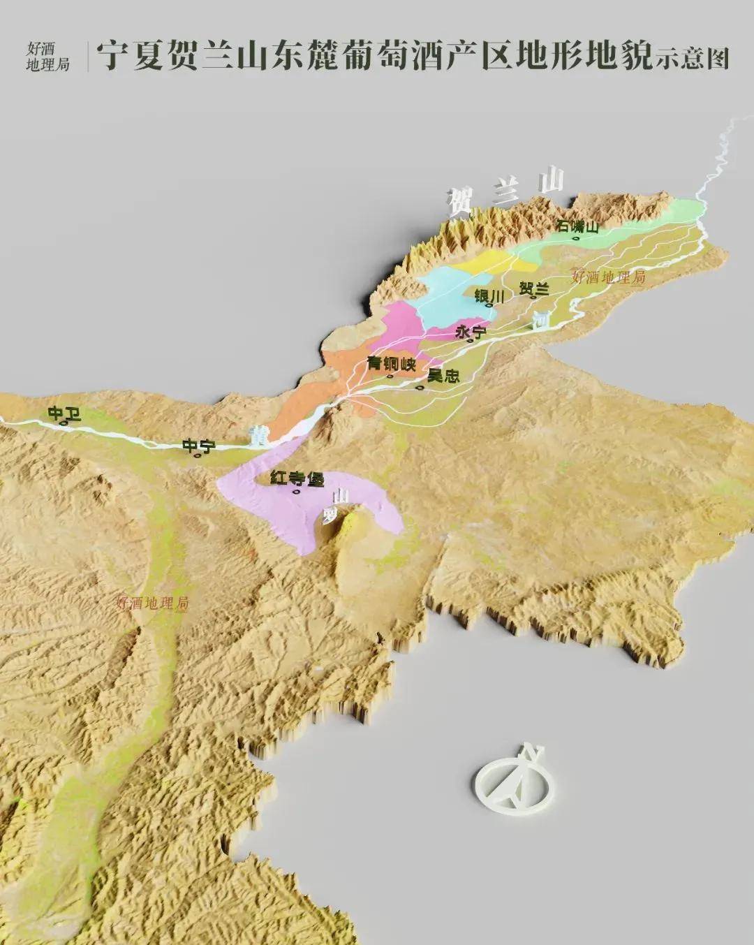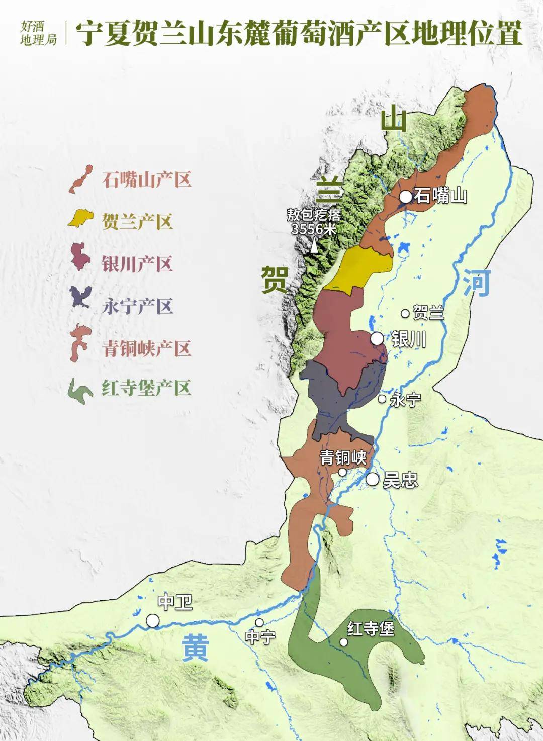 |贺兰山东麓葡萄酒产区地理分布,其中有6个子产区。 制图/好酒地理局视觉中心