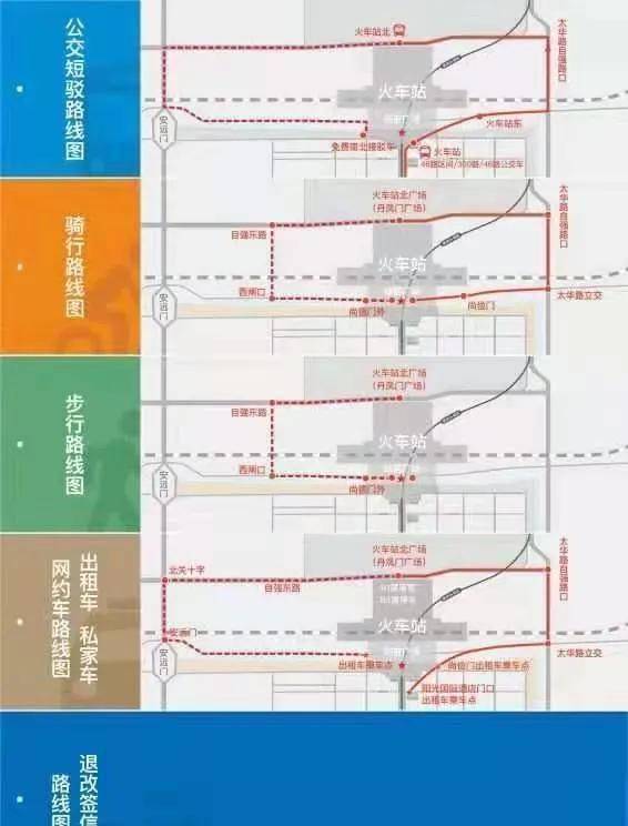 引导标识前置,在各单位的积极协调配合下,车站将“南广场封闭、北广场进出”以及“此地距北广场还有XX米”的标识贴在步行、骑行线路的关键点位,做好沿途路标引导。
