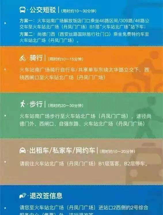 骑行步行攻略。步行旅客如果步行由南广场至北广场,西边至西闸口通行前往北广场用时25分钟,东边至太华路立交通行前往北广场用时35分钟,骑行约15分钟。南广场站前管委会在城墙下增加共享单车摆放点位,为旅客提供多一种出行选择。