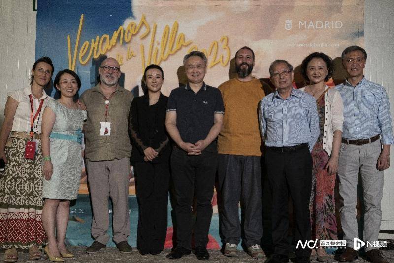 中国驻西班牙大使馆公使衔参赞贺踊(右一)、马德里中国文化中心主任杨长青(右二)、“城市之夏”艺术节艺术总监安赫尔·穆尔西亚(左三)、马德里市文化顾问何塞·路易斯·拉莫斯·罗莫(右四)、著名大提琴家王健(中)、广青交名誉团长余其铿(右三)、团长陈智敏(左二)、音乐总监景焕(左四)演出后合影