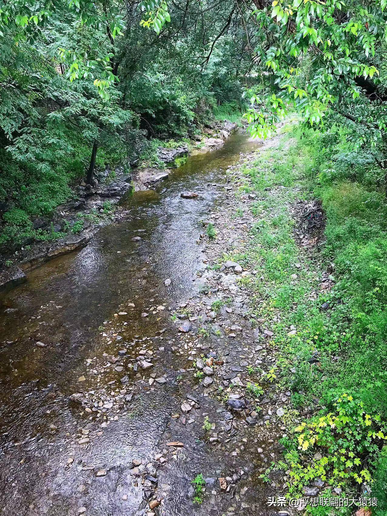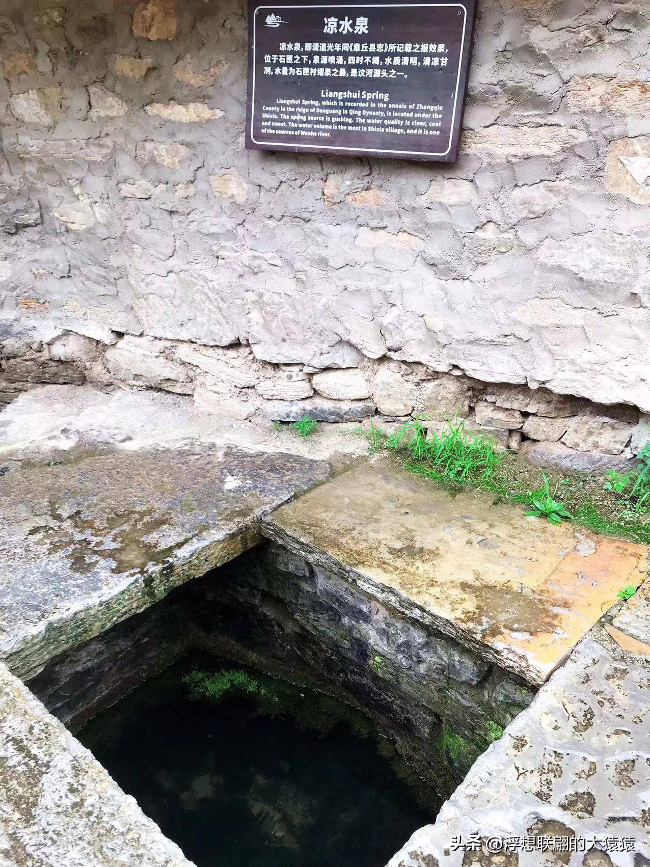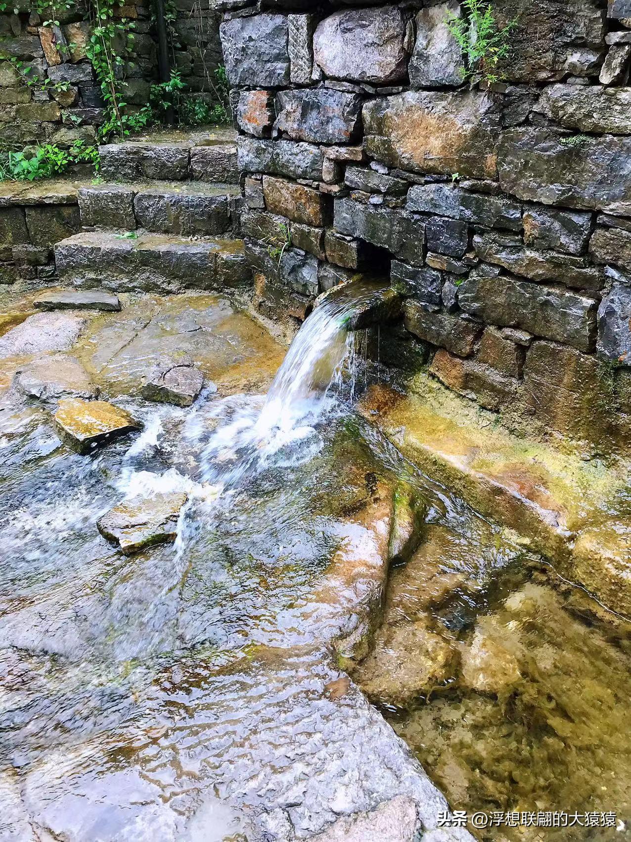 泉水是由洞里的石缝渗出来的,清透又冰凉,经椭圆的泉池中凿开的石洞流淌出来,狂奔进河道中。以前村里没通自来水之前都是饮用这里的泉水,我带桶了,但没打水。
