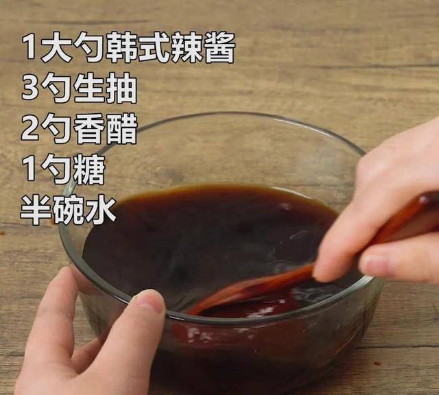 调个灵魂酱汁:1大勺韩式辣酱、3勺生抽、2勺香醋、1勺糖、半碗水,搅拌均匀。