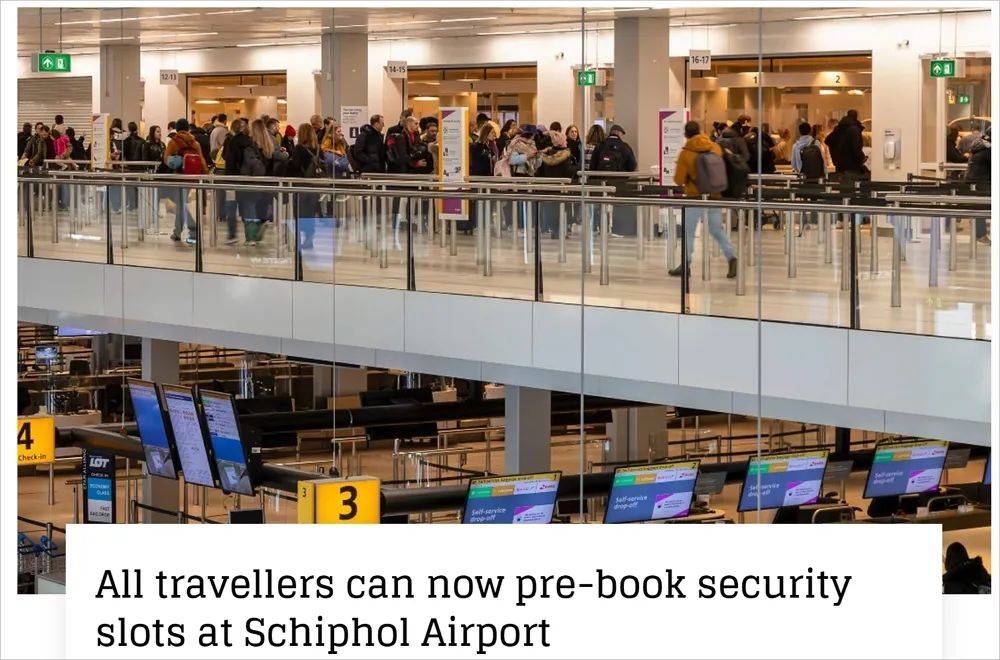 为了限制繁忙时段的乘客安检人数,减少排长队和延误的问题,荷兰史基浦机场在此前宣布,搭乘飞机前往申根国家航班的乘客可以在网上提前预订安检时间。