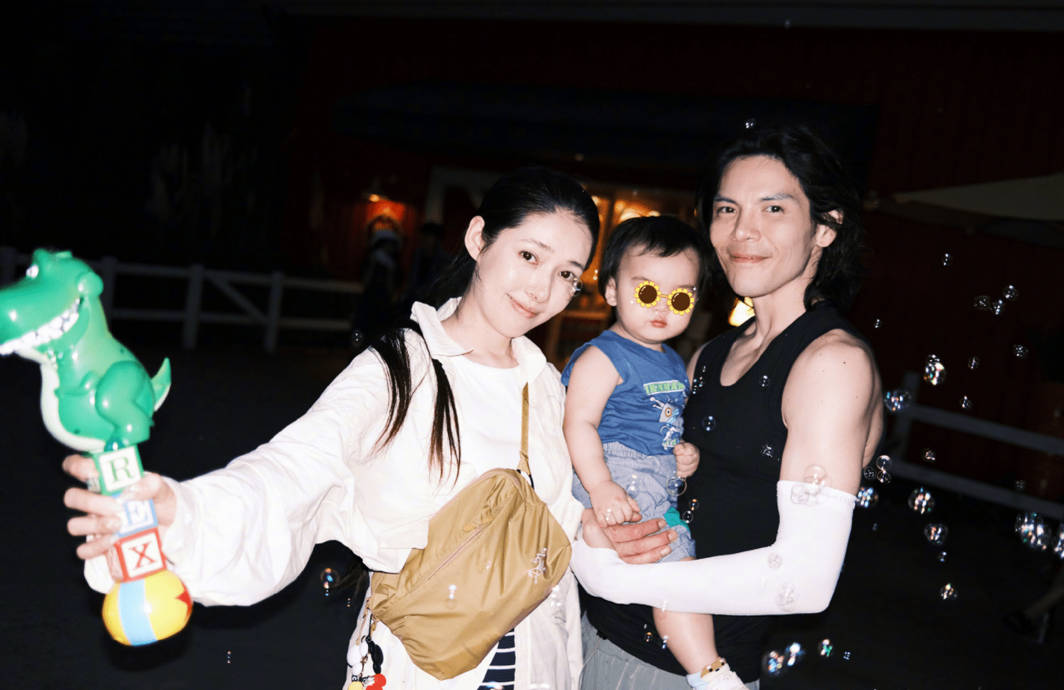向佐给女儿在迪士尼举高高,从背景不难看出游客真的很多。