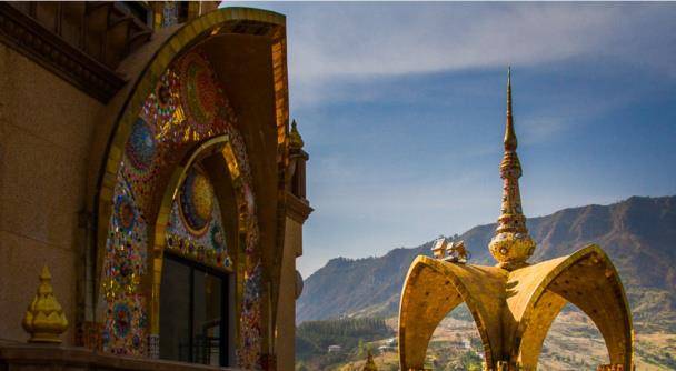 帕颂桥寺,坐落在碧差汶府的考科山山顶,整个寺庙造型犹如云海中的珠宝,是当地的佛教研究和冥想中心。他们供奉的是释迦牟尼五头佛,话说这个五头佛比曼谷的四面佛更加灵验,到底是不是只有他们当地人才比较清楚,寺庙到处都是金碧辉煌,而且墙壁上还装饰着各种珠宝,最神奇的是,这些珠宝不仅没有越来越少,反倒变得越来越多,这是咋回事呢?