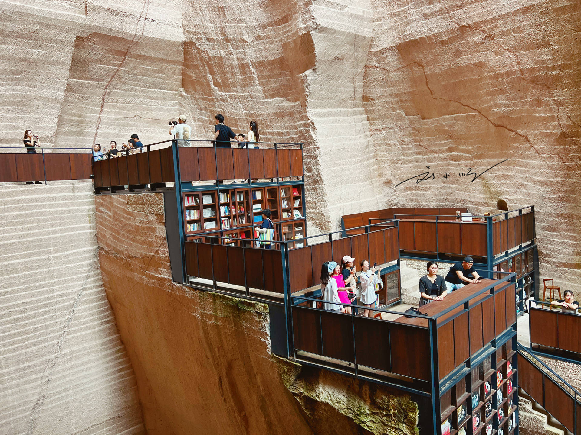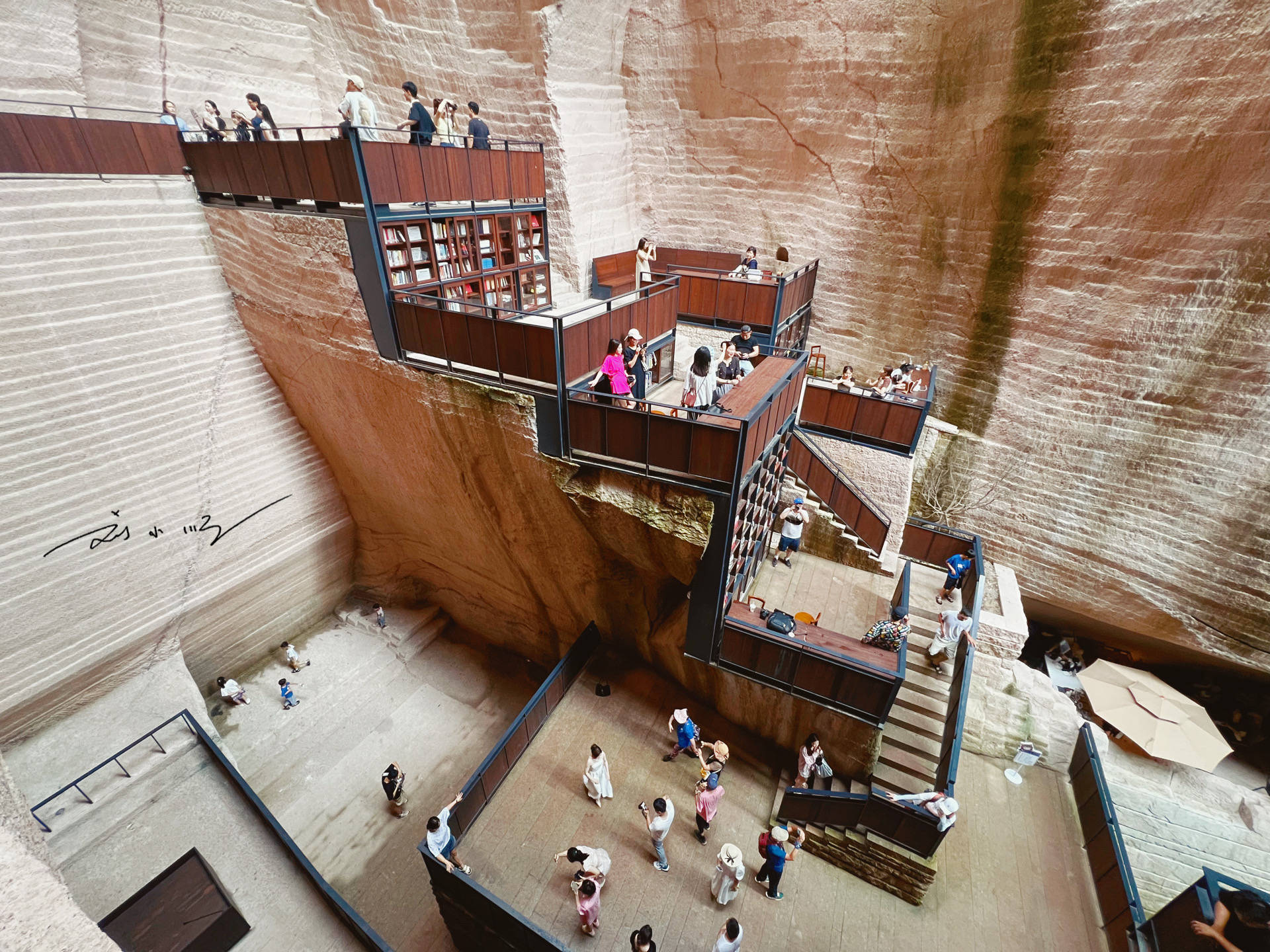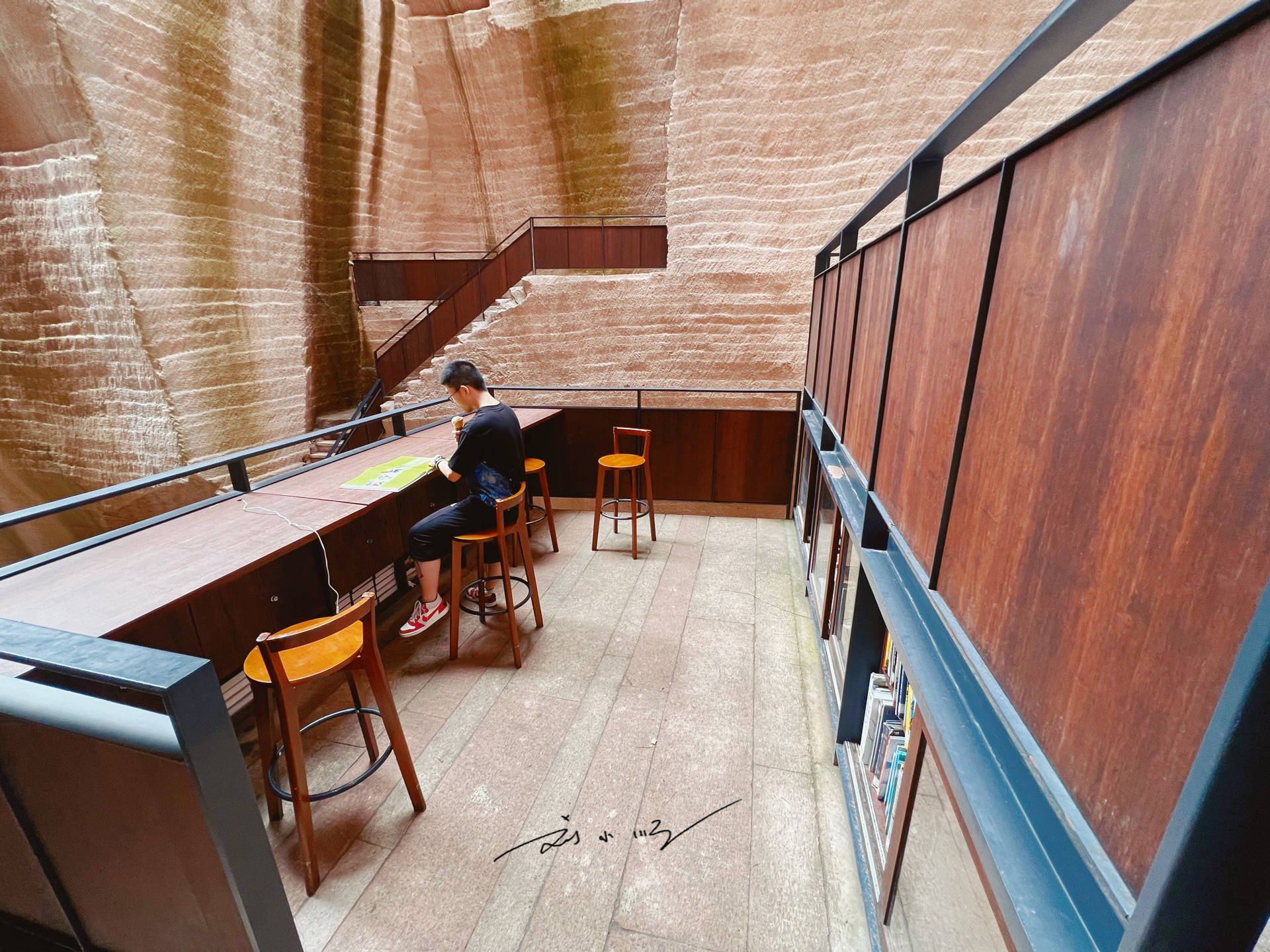 “岩宕书房”所在的洞窟有数十米之高,抬头望去,书架与座椅依岩壁而建,在最大程度地保护洞窟原本状态的同时,又加入了许多现代时尚的设计元素。