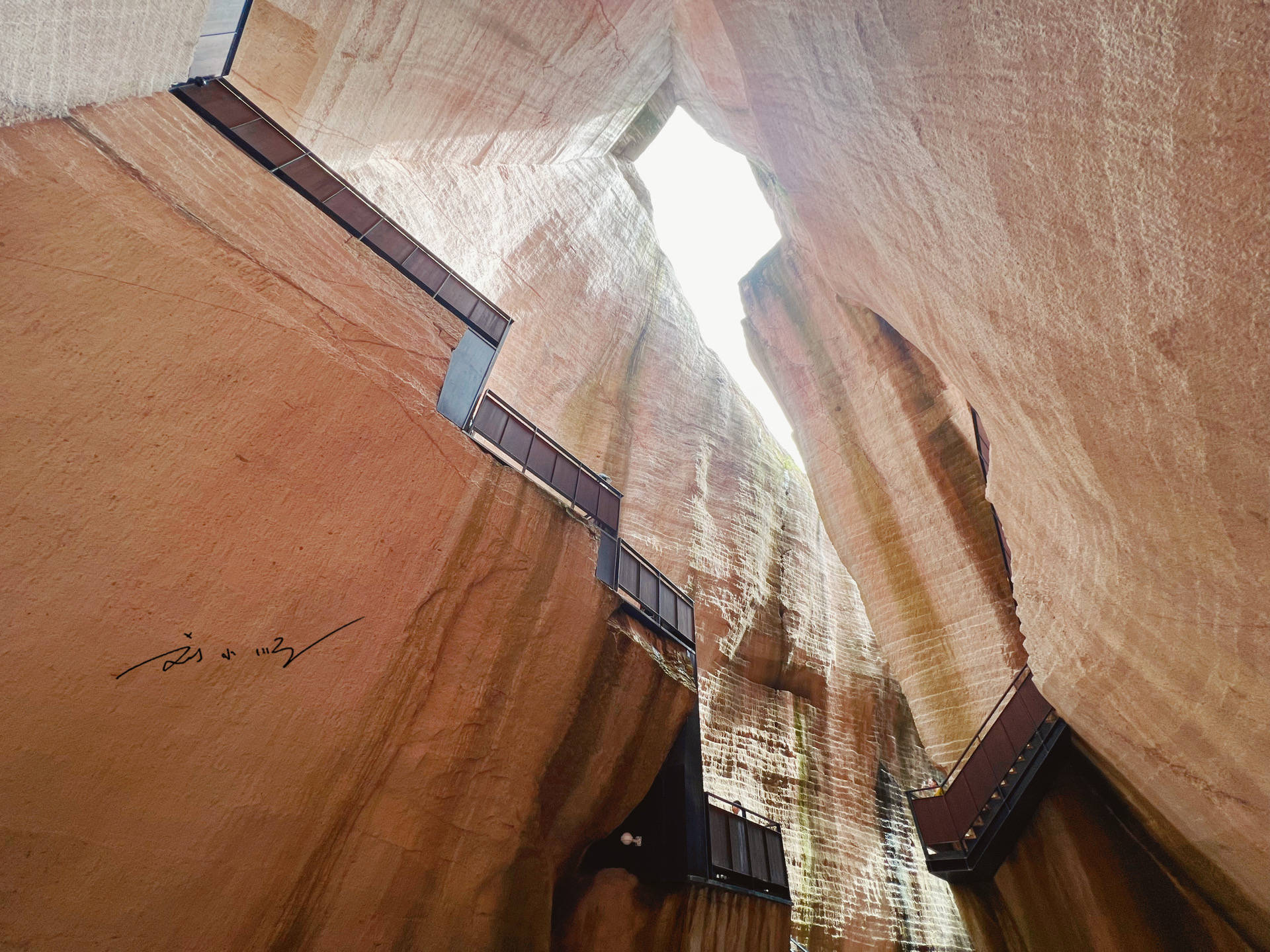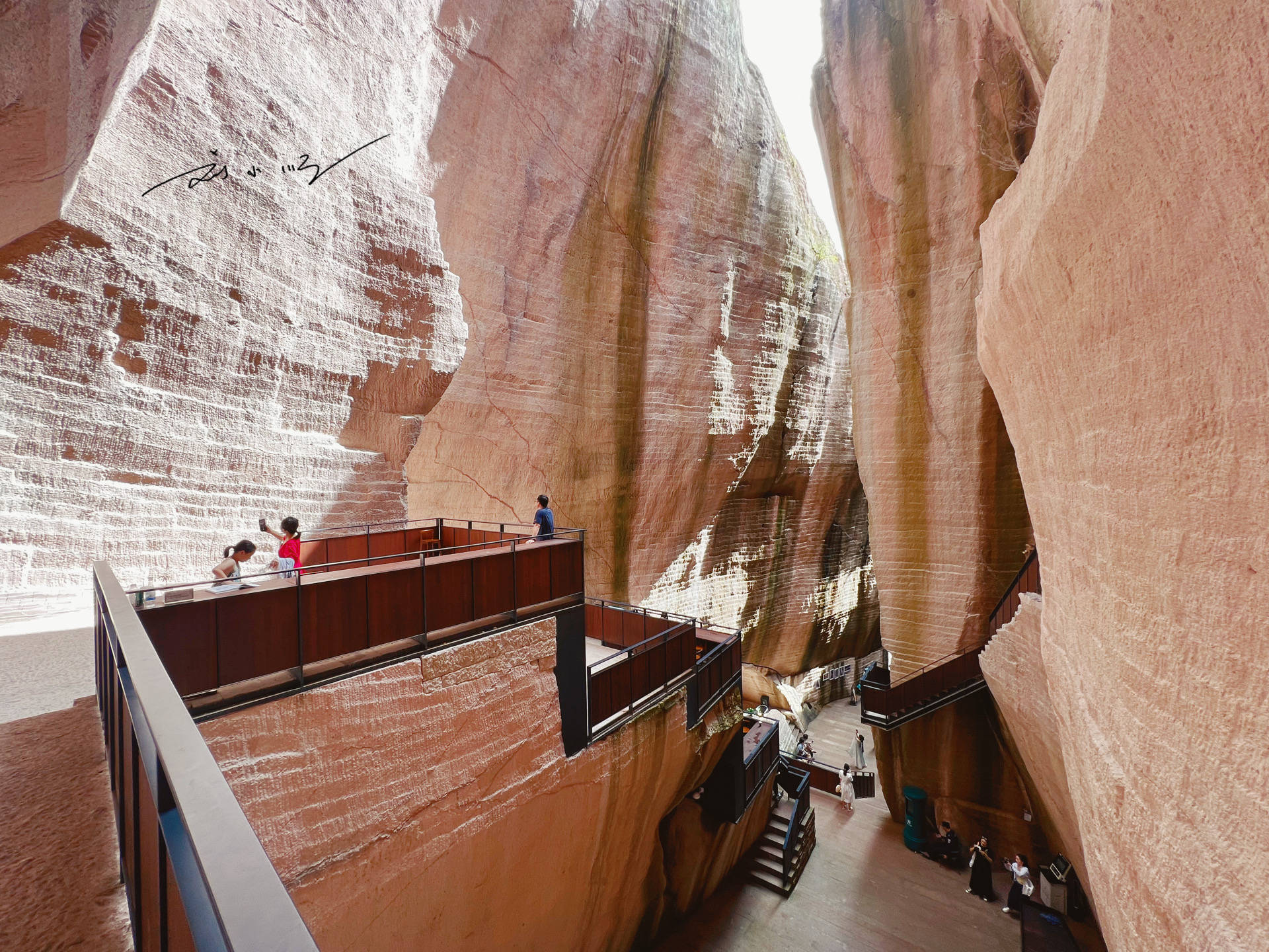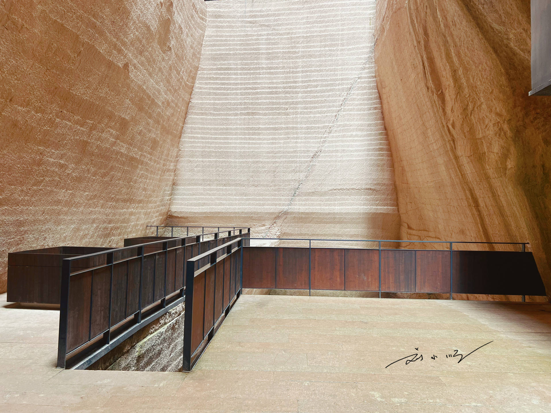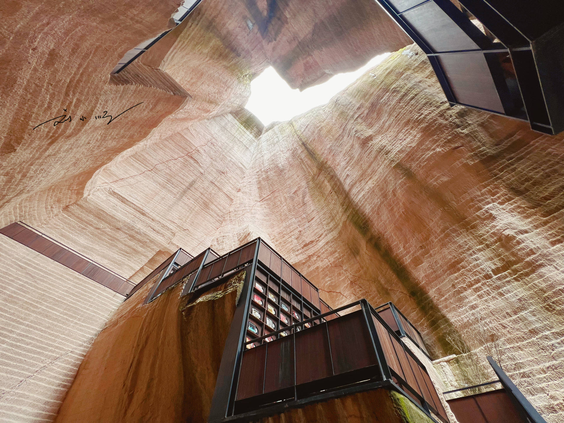 “岩宕书房”所在的洞窟有数十米之高,抬头望去,书架与座椅依岩壁而建,在最大程度地保护洞窟原本状态的同时,又加入了许多现代时尚的设计元素。