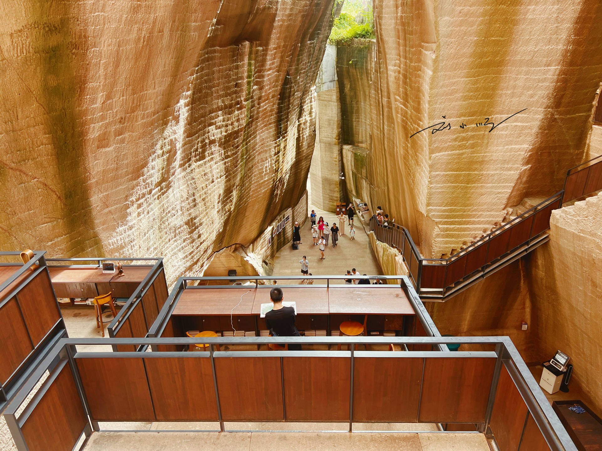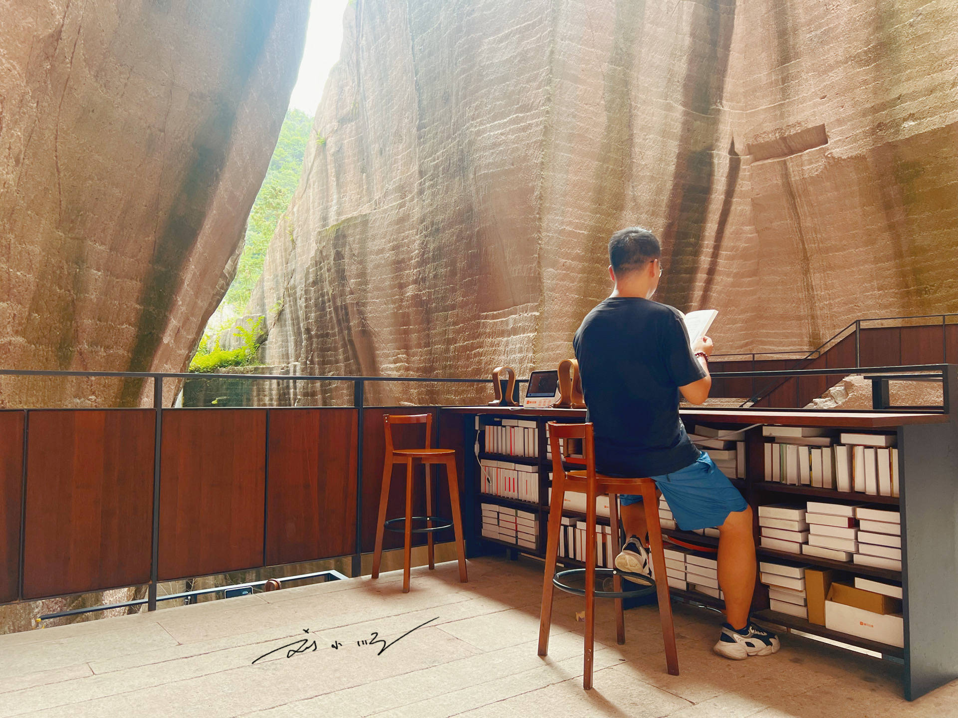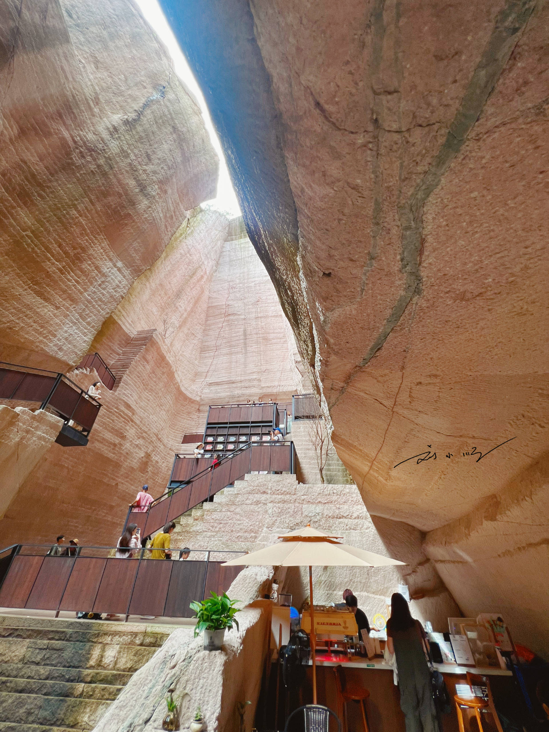 而在“岩宕书房”里,还有一家名叫“喜笑岩开”的咖啡馆,阳光从洞口顶部洒下来,坐在咖啡馆里一边看书一边喝咖啡,真是再惬意不过的享受了!