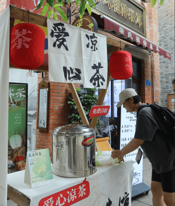 盛夏至,何以解暑意,梯坎一杯老荫茶。近日,高温天气频发,为了防止游客中暑,从7月20日起,重庆十八梯特意联动场内各大商家开展了夏日老荫茶赠饮公益活动,游客可以前往指定地点免费领取老荫茶,多个赠饮摊位分布在十八梯各个区域,为游客清凉出游贡献力量。同时,场内商家更是开放纳凉区域免费提供游客休憩。