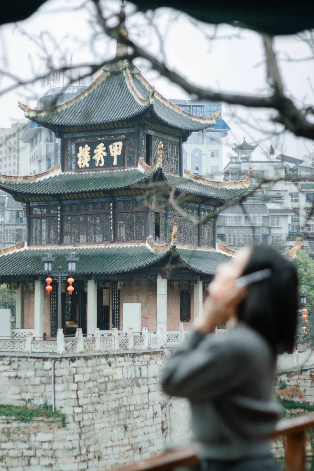 甲秀楼的左右,分别隐有趣味。过“浮玉桥”,往左便是“翠微园”,园内长廊九曲回转,再沿石阶往上走,便能将近处的甲秀楼、远处的高楼尽收眼底,现代与历史的气息浑然相融。