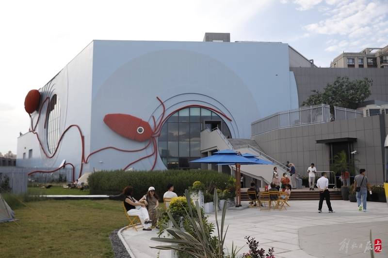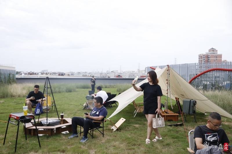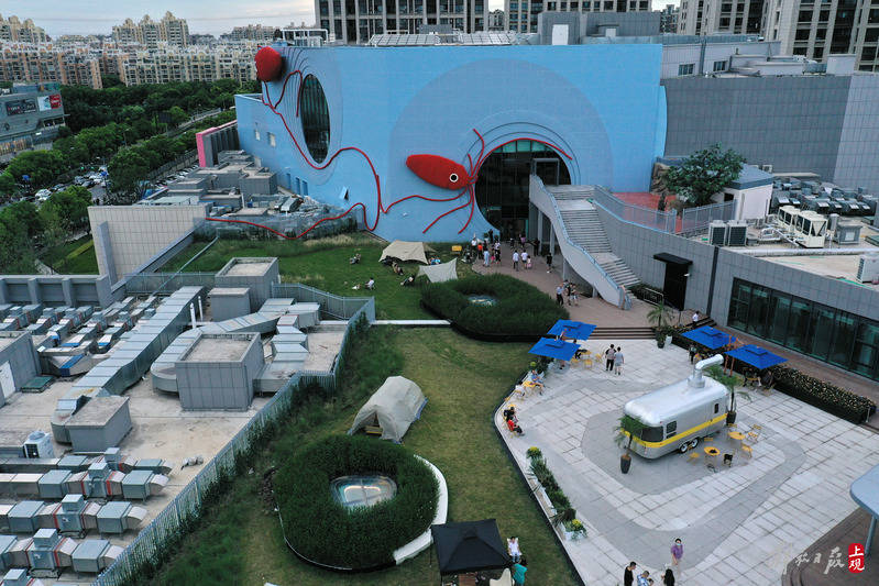 海洋馆外,商场屋顶被打造成开放式休憩空间,市民可以感受露营野趣,也可静坐感受凉风拂过带来的快意。