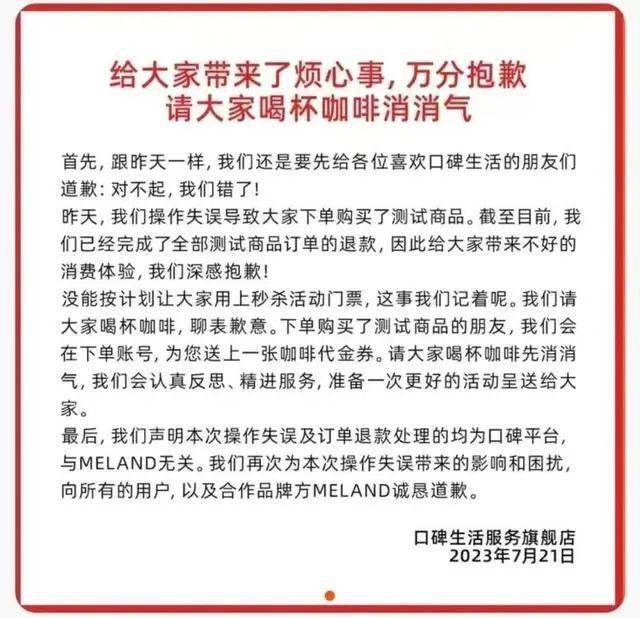7月21日, 口碑生活再次道歉,表示给下单的账号送一张咖啡代金券聊表歉意。“我们声明本次操作失误及订单退款处理均为口碑平台,与MELAND 无关。”致歉声明最后称。