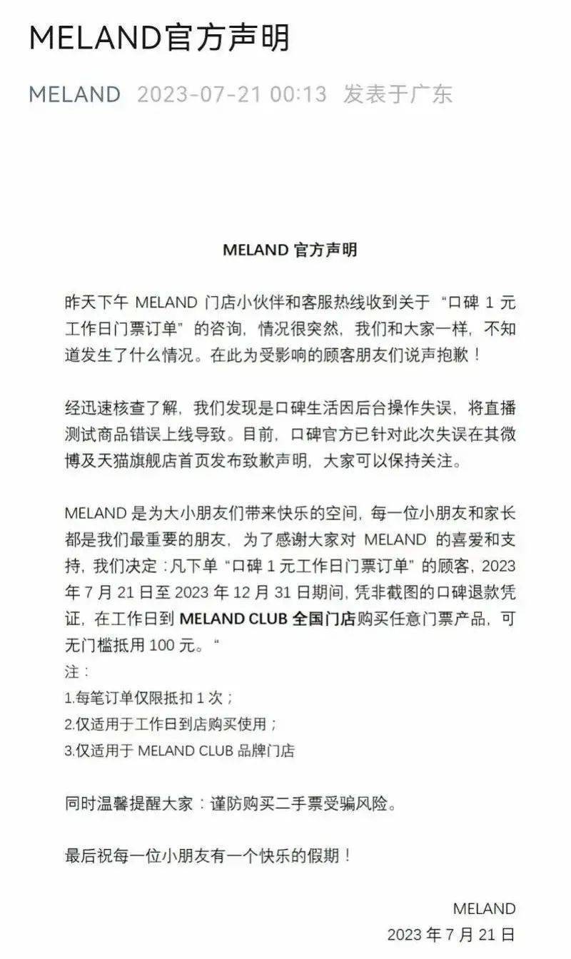 在表达歉意的同时,MELAND还决定:凡下单“口碑1元工作日门票订单”的顾客,2023年7月21日至2023年12月31日期间,凭非截图的口碑退款凭证,在工作日到MELANDCLUB 全国门店购买任意门票产品, 可无门槛抵用100元。