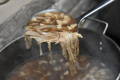 除了祖传的豆腐脑,蔺师傅还做的有胡辣汤,这锅胡辣汤是他自创的,用牛骨和牛油熬汤,然后放豆筋、豆芯、豆皮、豆丝等四种豆制品,另外加上他用三十多种大料配制的秘料,喝起来也很过瘾,虽说没有豆腐脑名气大,可追随者也不少。