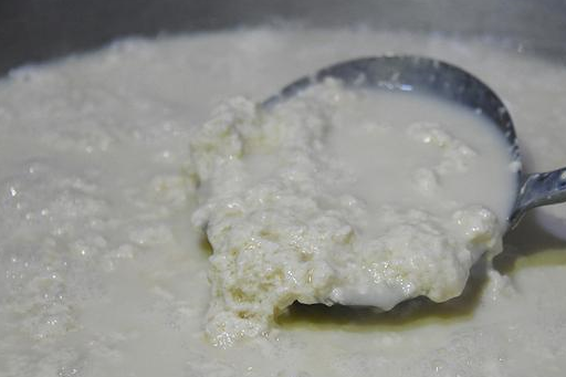 煮好的豆浆,倒进一点卤水,在四五分钟之内就能变成花状的豆腐脑,蔺师傅说卤水的制作也比较复杂,取材于盐碱地的盐碱水,然后经历多道工序,放置一年后才能用来点豆腐脑。