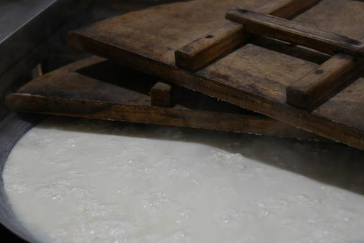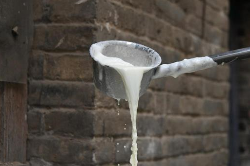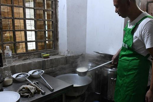 据蔺师傅介绍,做豆腐脑要经历浸泡、打浆、煮浆、点浆等多道工序,为了保持稳定的口感,黄豆选用本地产的笨大豆,浸泡的时间不低于24小时,打浆过滤之后就在这口锅里进行煮制。