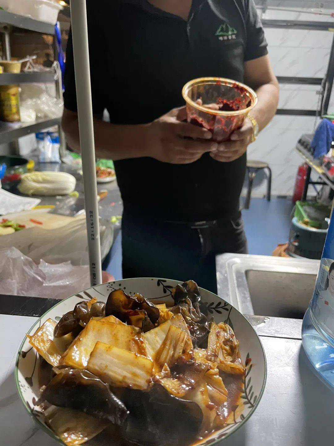 厨师拿出一罐辣椒酱跟我解释,“只放了点这个”。真是笑死,好像厨师不放点辣椒都不会炒菜了~