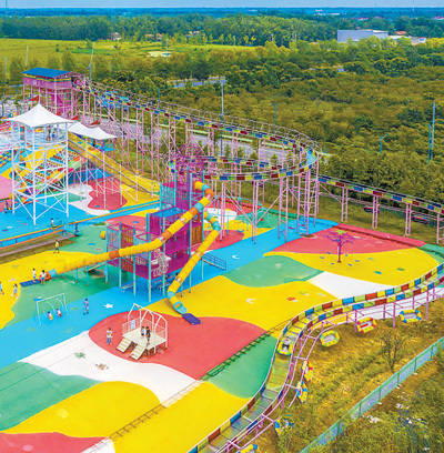 江苏省宿迁市宿豫区坚持“农旅结合、以旅强农”,充分利用生态资源优势,积极推进现代休闲观光农业和乡村旅游融合发展。图为近日,游客在新庄镇杉荷园社区森林王国游乐园游玩。 徐 瑞摄