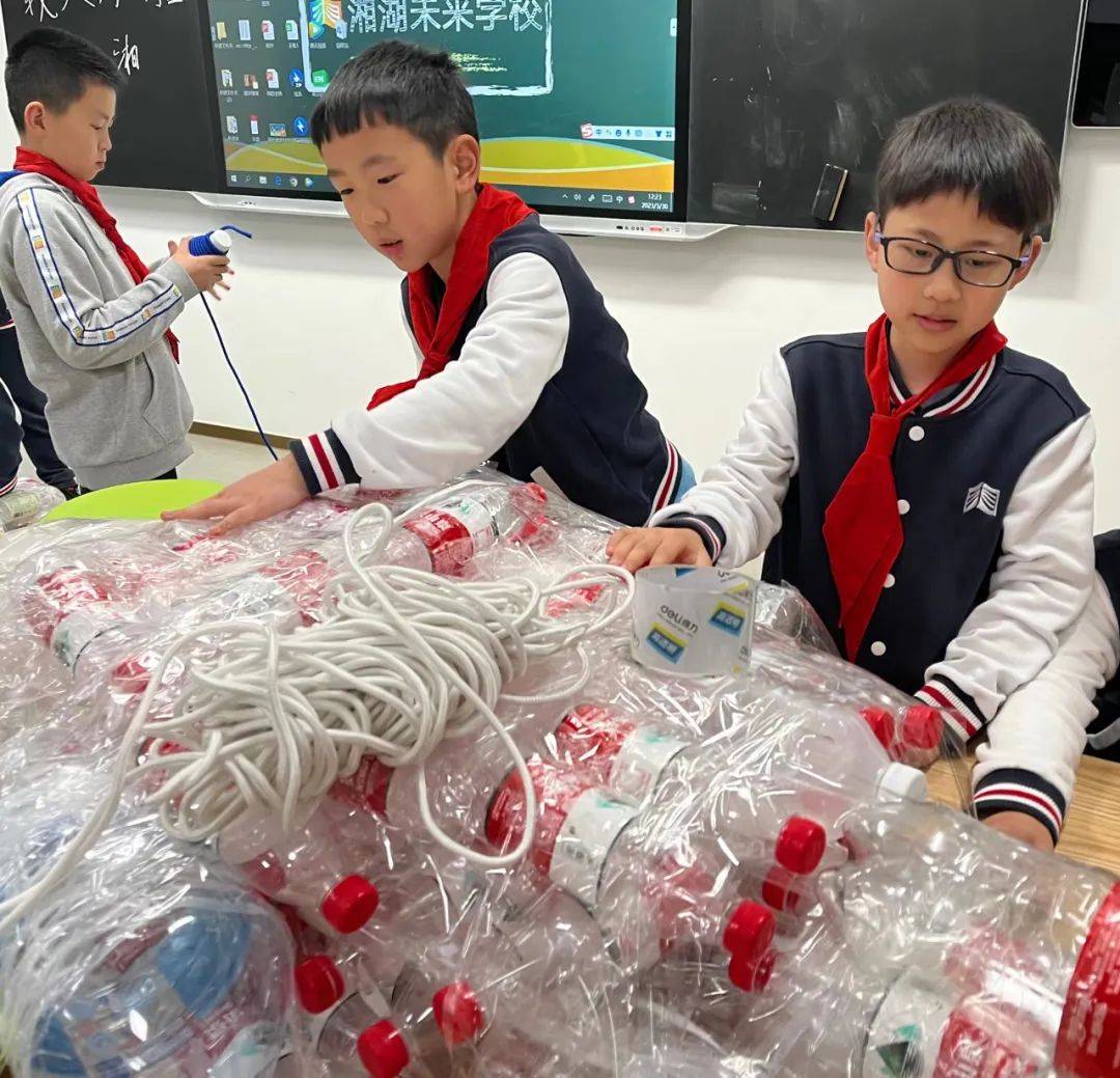 科学老师首先向五、六年级的学生发布环保召集令,科普废塑料瓶的利用价值,并号召学生收集废旧塑料瓶。