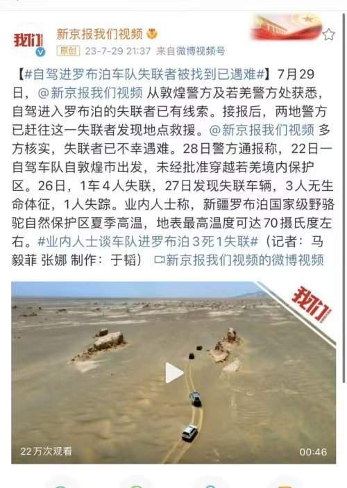 我这两天看到了一条新闻,说是从7月22日自敦煌市出发的,未经批准自驾进入罗布泊的4名失联者,目前已经确认全部遇难了。