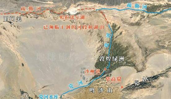 先看一下玉门关:党河汇入疏勒河以后,继续向西最终流入罗布泊,但这一段并不那么固定,很多时候会断流,至少在西汉时,玉门关内这一段并没有断流,玉门关外则是时断时续,所以也可以说玉门关一带是疏勒河的西部终点,这就是当年玉门关选址的原因。