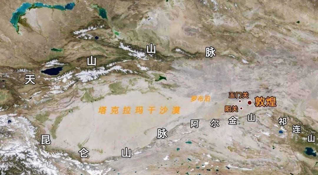 因为汉朝开拓的丝绸之路是沿着塔里木盆地的南北边缘前进的,敦煌城正好在塔里木盆地最东端。敦煌身后是交通要道河西走廊,往前便是占地极为辽阔的西域,西域中心是塔克拉玛干大沙漠,沙漠南北两线边缘才有间断的绿洲带,才可能开拓出道路。
