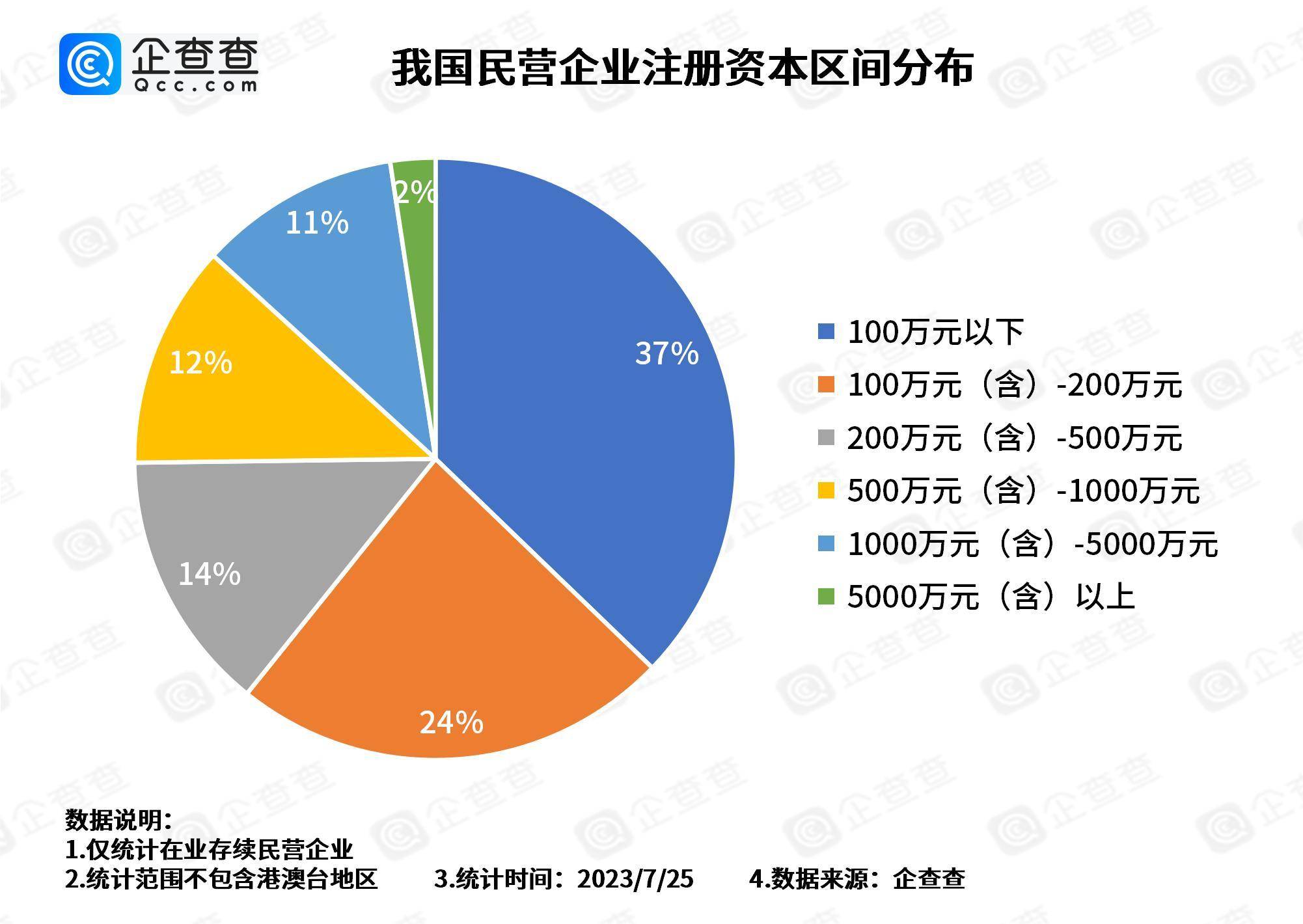 注册资本在200万元至500万元之间的民营企业有795.7万家,占比14.0%;注册资本在500万元至1000万元之间的民营企业有680.4万家,占比12.0%;注册资本在1000万元以上的民营企业有748.7万家,占比13.2%。