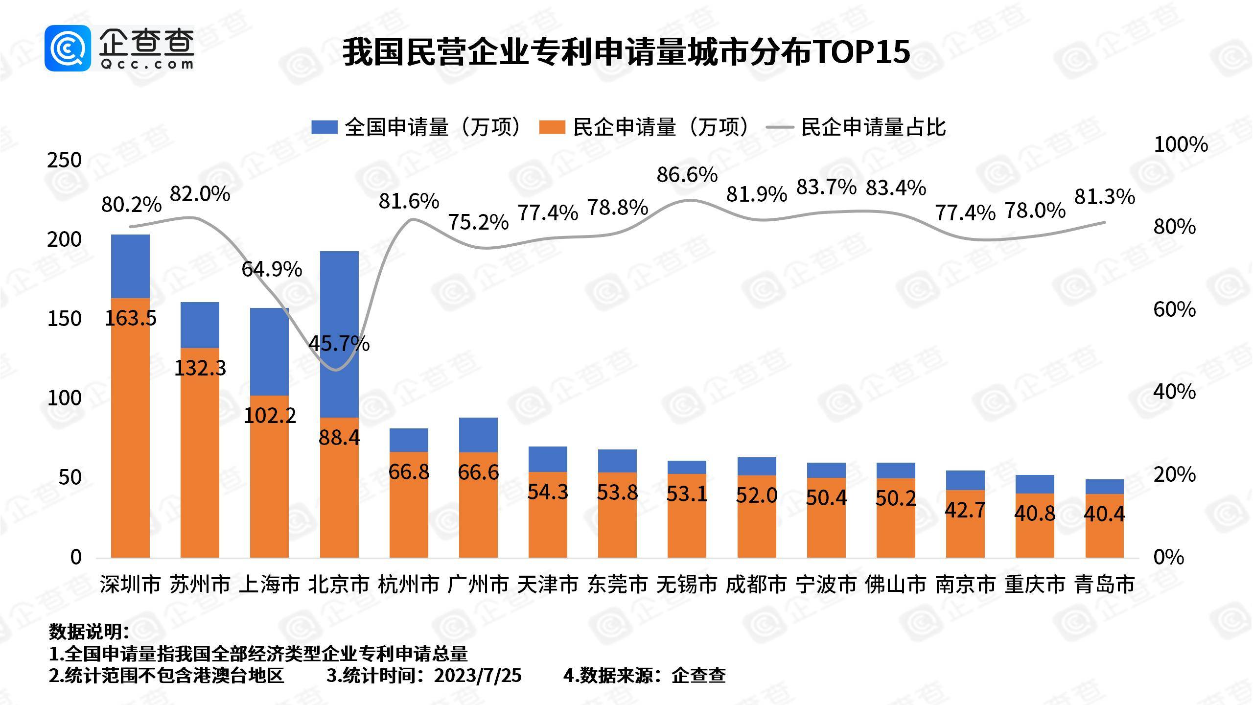 根据民营企业专利申请量城市分布TOP15,深圳市民营企业创新能力更强,已申请注册163.5万项专利,排名全国第一,苏州市民营企业已申请注册132.3万项专利,领先上海,排名第二,上海市民营企业已申请注册102.2万项专利,排名第三;北京市、杭州市、广州市民营企业分别已申请注册88.4万项、66.8万项、66.6万项专利,排名前六。