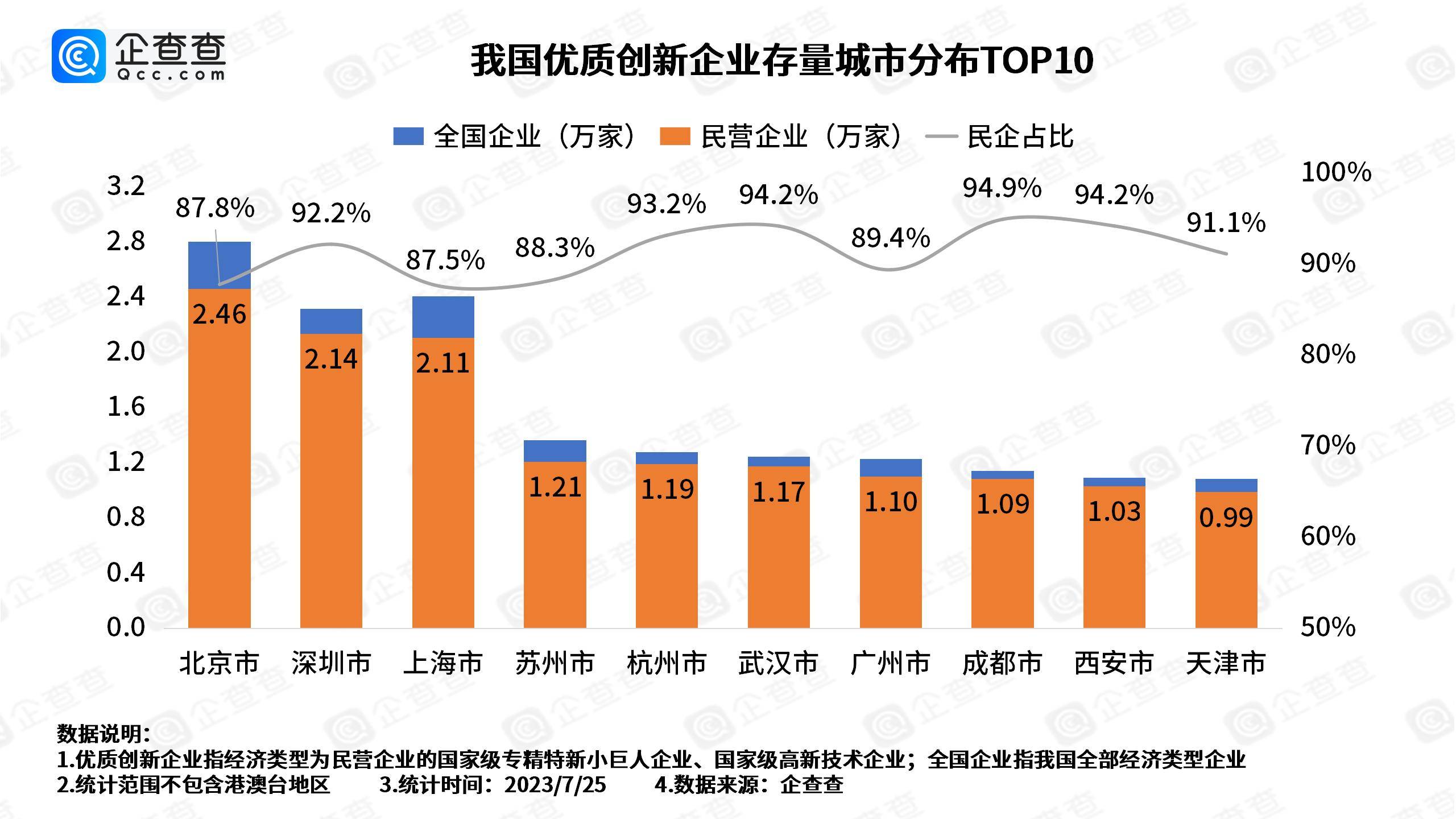 企查查数据显示,截至2023年7月24日,我国合计现存40.3万家优质创新企业,其中民营企业有36.9万家,占比91.6%。