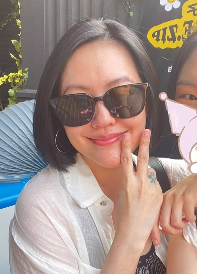 小s戴着墨镜比耶,面带微笑。