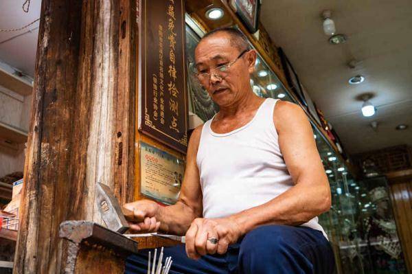 青岩古镇内匠人正在手工打造银饰。人民网 阳茜摄